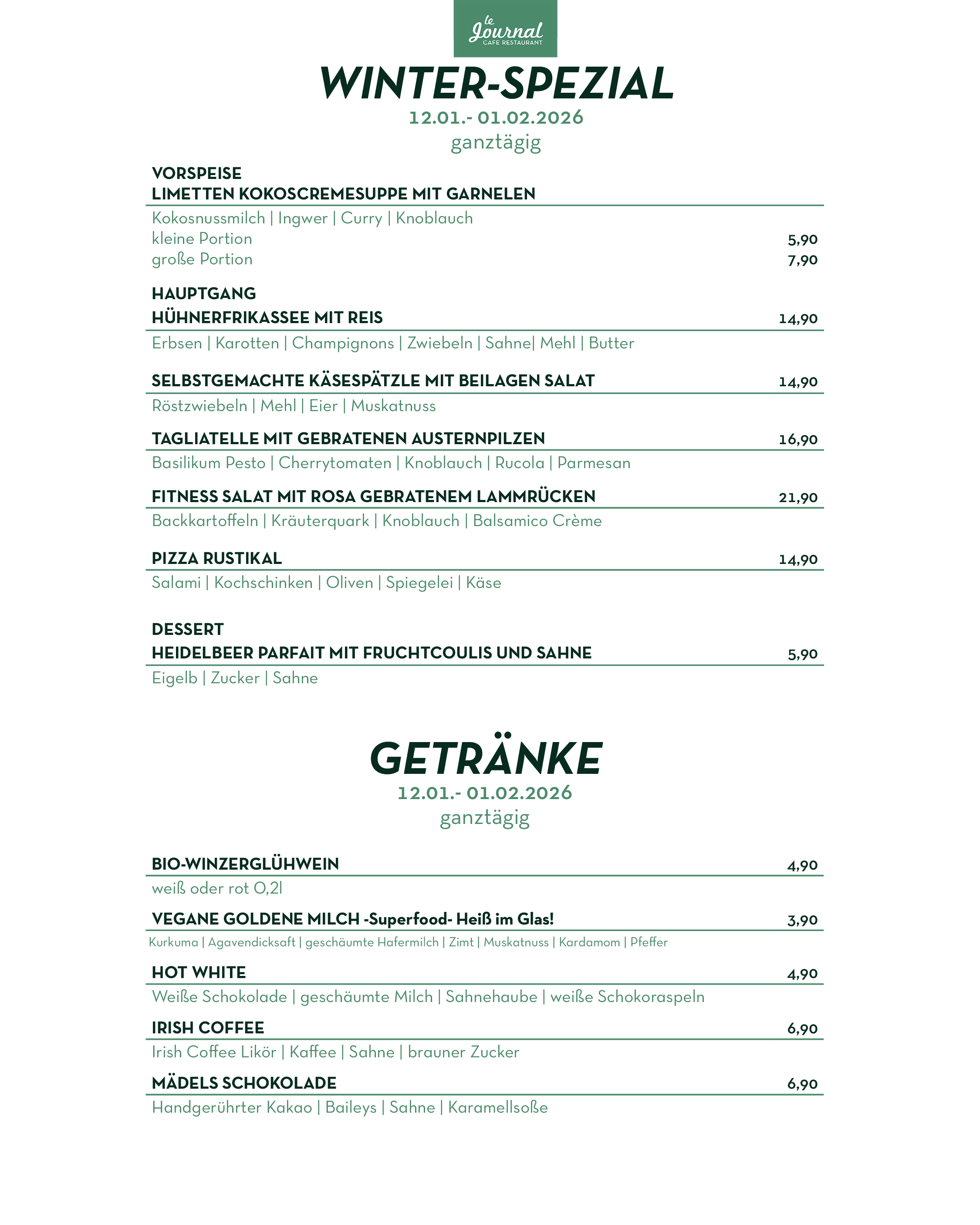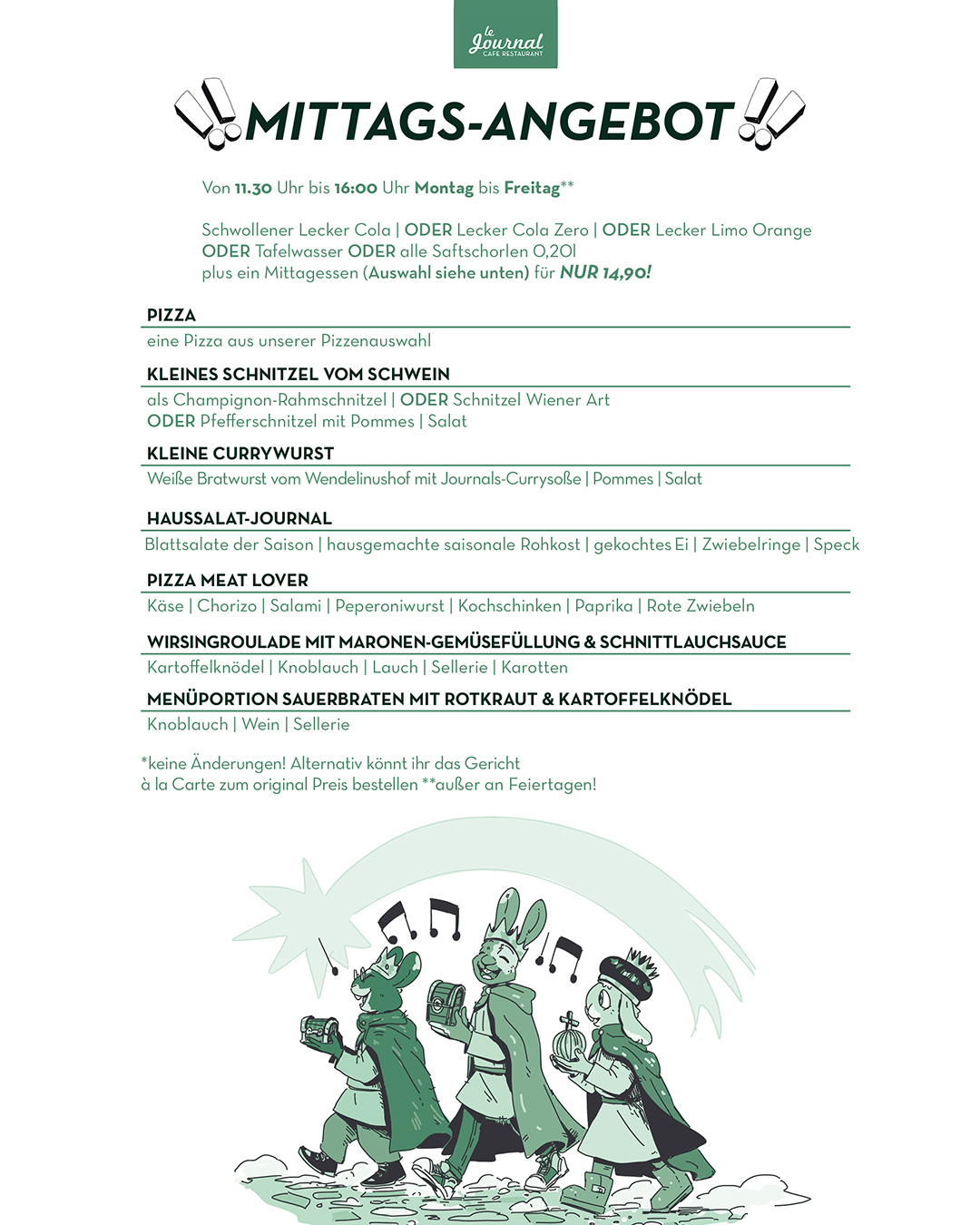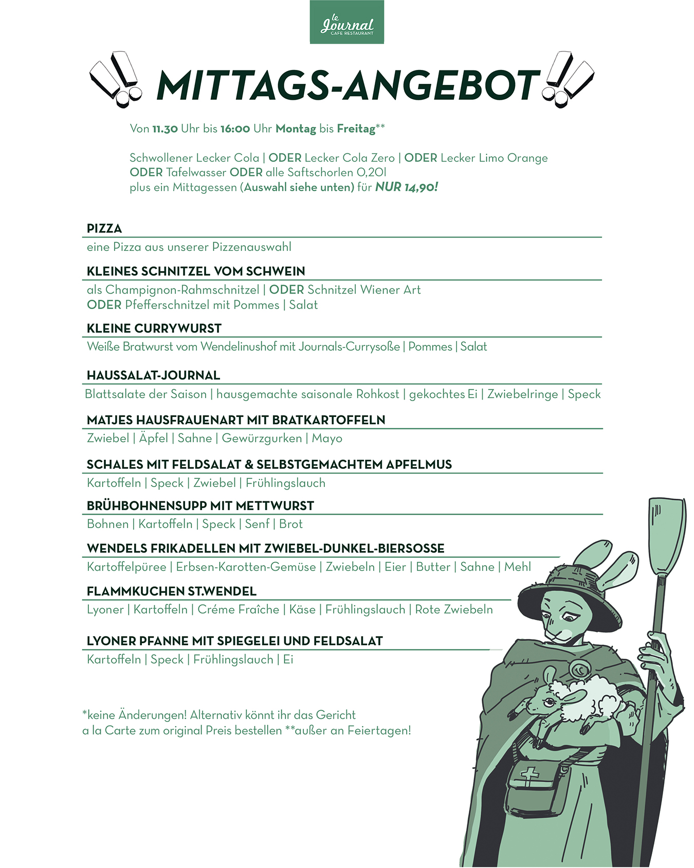 durchgehend warme Küche von 11.30 Uhr bis Open End (mind. bis 21.00 Uhr)