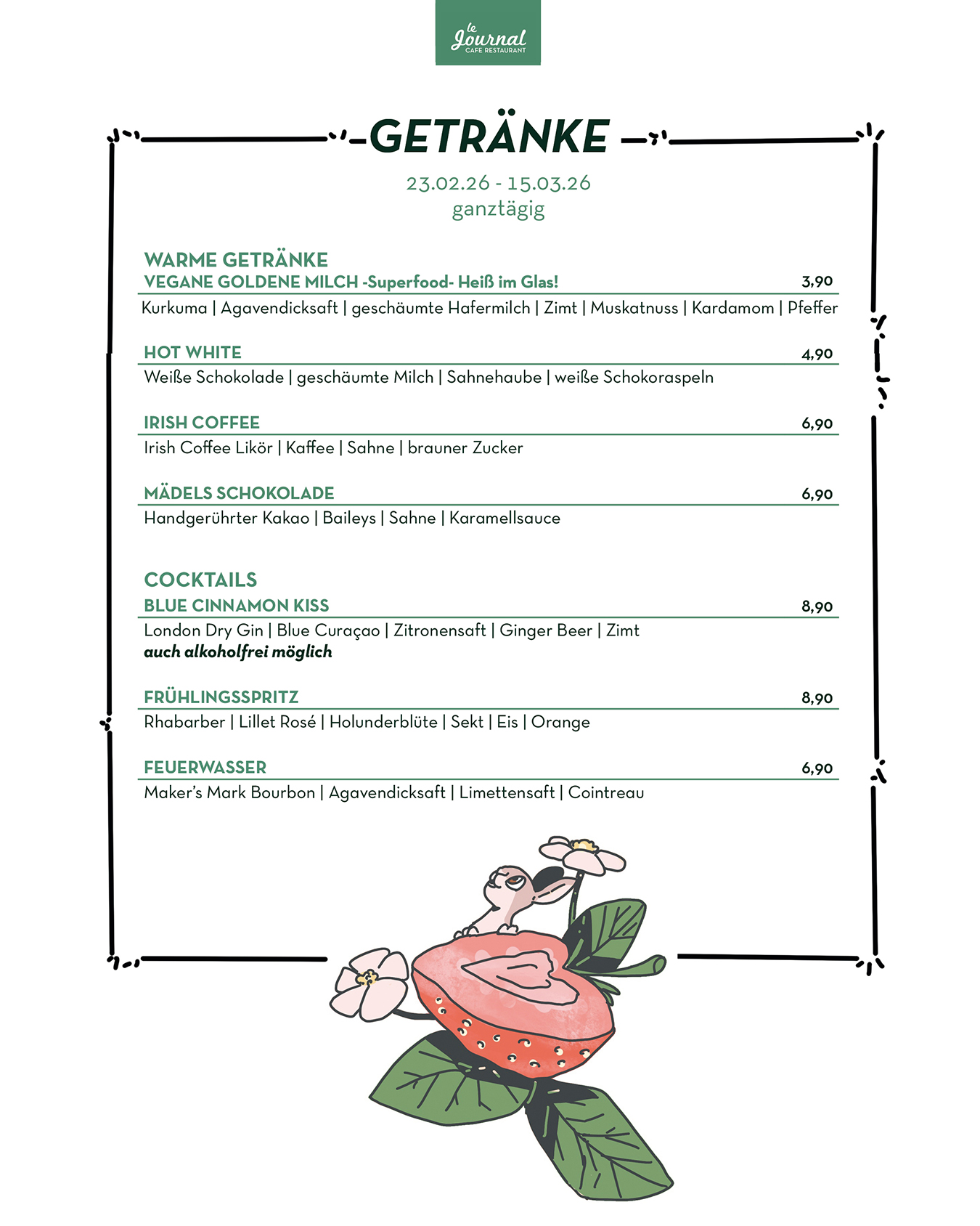 durchgehend warme Küche von 11.30 Uhr bis Open End (mind. bis 21.00 Uhr)
